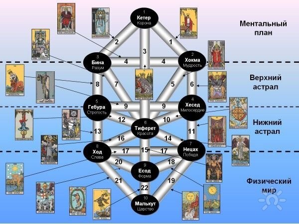 Например, рисунок на Шуте или расположение пентаклей на аркане 10 пентаклей — отсылка к Древу Сефирот.