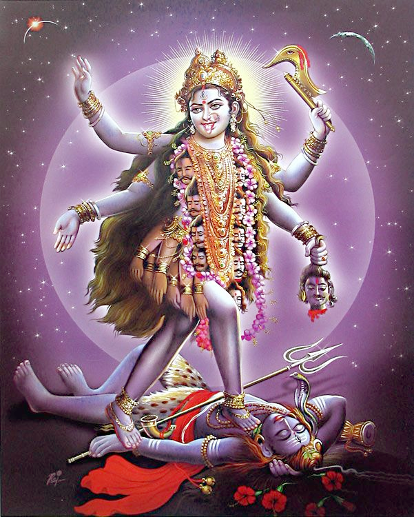 Синяя кожа, змеящиеся черные волосы, человеческие головы вместо ожерелья и злобные духи, окружающие свою предводительницу. Кали – разрушительница, она грозит миру катастрофами, болезнями и смертью.