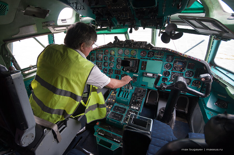 ↓ Кабина в хорошем состоянии. Слева КВС, справа второй пилот, между ними чуть сзади — место штурмана. «На самом деле, он главный, отвечает за большее количество приборов и объясняет этим двум дуракам, куда лететь», — шутит Рафаэль Тагирович.
