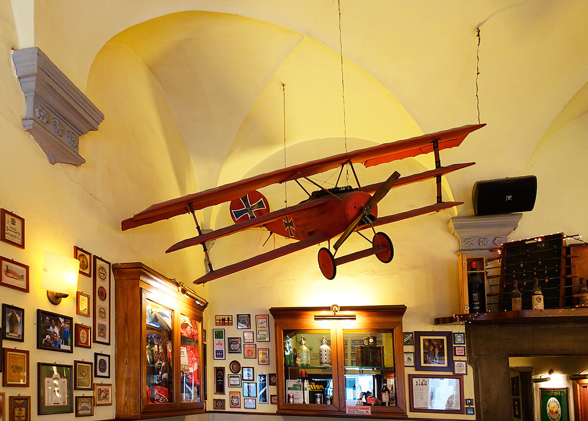 Получили горячительное согревающее и только тут я заметила, что над головой Виктора парит... красный самолет с черными крестами времен Первой мировой.