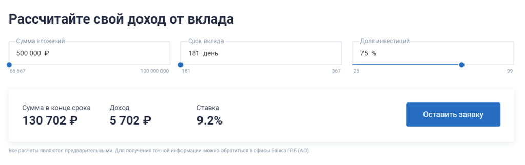 - Например, выбираем вклад «Перспектива (с ИСЖ)». На сайте Газпромбанка есть калькулятор, который сразу показывает сумму: при вкладе 500 000 рублей на 181 день вы получаете доход в размере 5 702 рублей и ставку 9,2%.