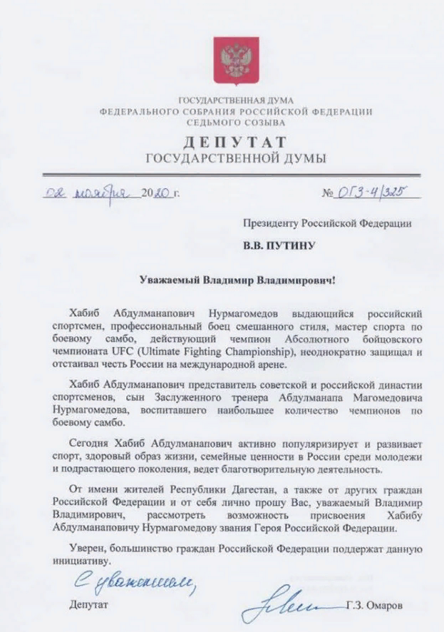 Вчера я наткнулся на новость о том, что "Депутат Госдумы Гаджимурад Омаров написал письмо президенту России Владимиру Путину с прошением рассмотреть возможность присвоения чемпиону UFC в легком весе Хабибу Нурмагомедову звания Героя России." Ссылка на новость будет в конце статьи.