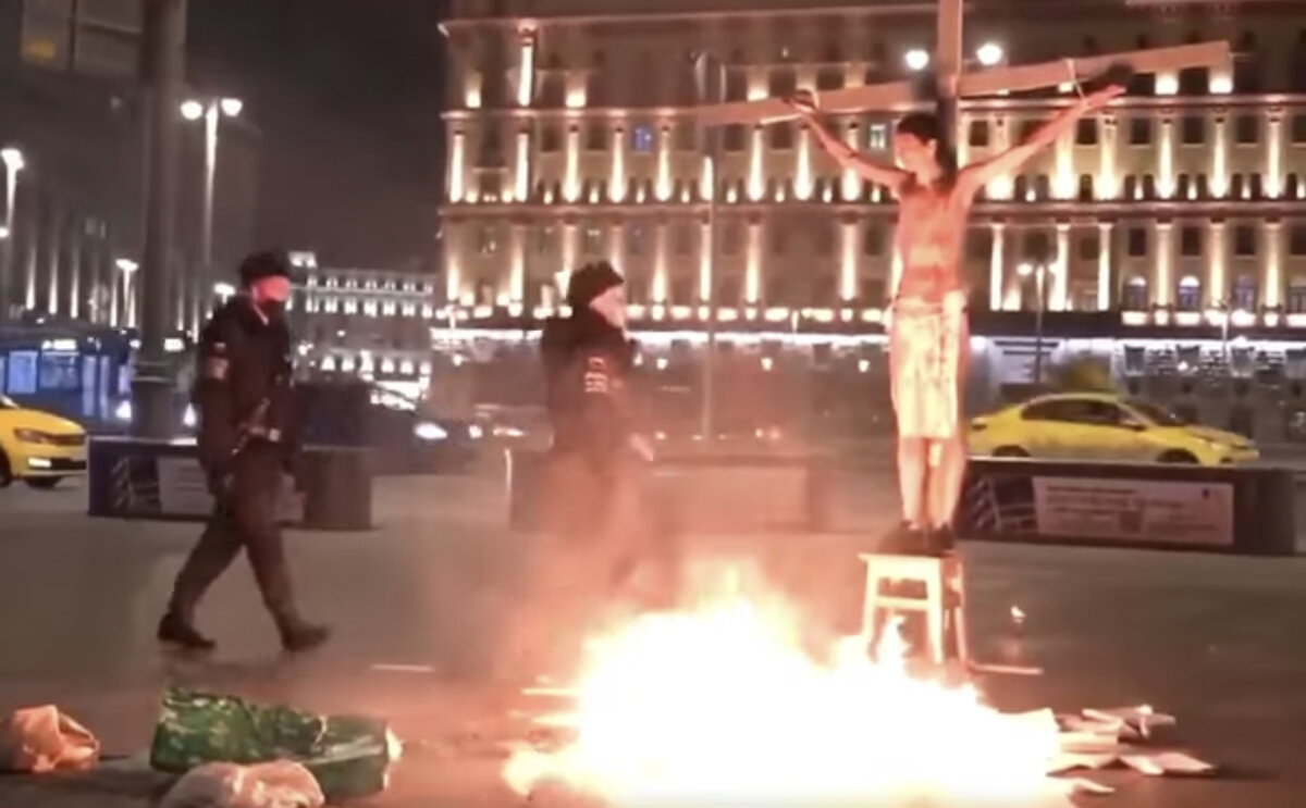 Вечером 5 ноября в центре Москвы, неподалеку от здания ФСБ на Лубянке, состоялся эффектный перфоманс. Известный акционист Павел Крисевич в набедренной повязке изобразил Иисуса Христа, распяв себя на кресте.