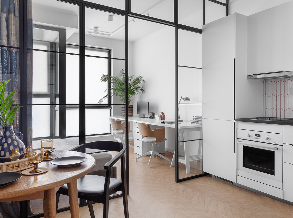 В маленькой квартире дизайнеры создали функциональную и удобную планировку. Возле лоджии и окна разместили спальню и рабочие места. Пространство зонировано раздвижной стеклянной перегородкой — при необходимости приватный блок можно скрыть полностью от посторонних глаз при помощи плотных штор. На кухне организовали полноценную зону готовки и столовую для встреч с друзьями. Динамику в пространстве задает цвет, который также визуально разделяет функциональные зоны.