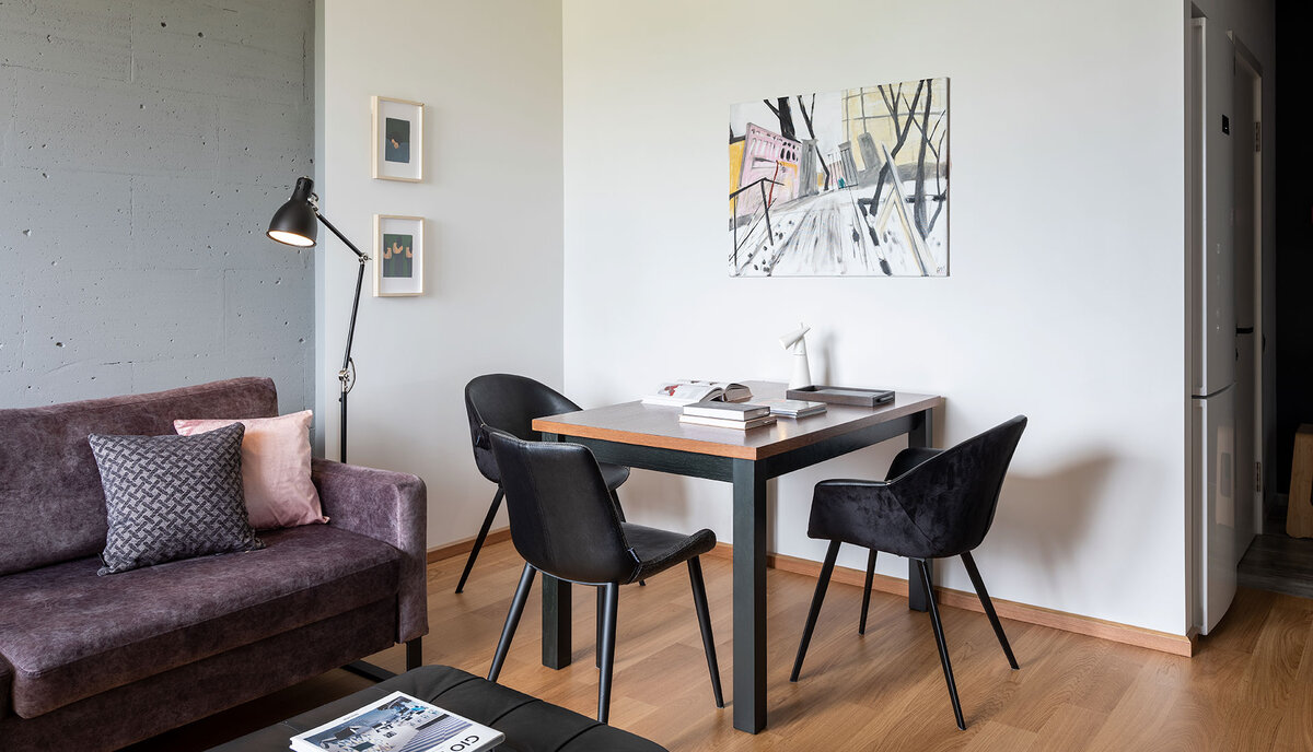 Молодой заказчик поставил задачу спроектировать интерьер для одного человека: современный, комфортный, «теплый» по ощущением. Просил предусмотреть место для книг и большой обеденный стол, за которым при необходимости можно было бы поработать. Обязательное условие — не выходить за рамки установленного бюджета.