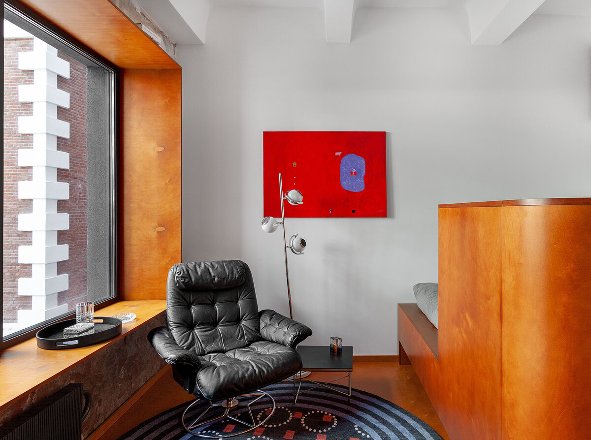 Узел реконструкции колонны оставили нетронутым, сохранили стену без отделки у рабочего места. Такое решение нам показалось очень интересным и красивым. «Вся мебель для проекта не новая. Кресло нашли очень спонтанно в инстаграм. Мы до сих пор не можем опознать производителя кресла, но нам всем оно очень понравилось: то, как оно вписалось в интерьер и принесло свою атмосферу».