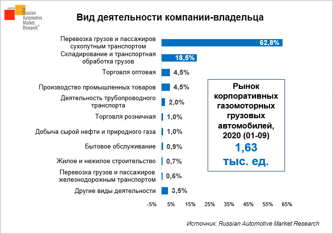 Юридические лица с основным видом деятельности «перевозка грузов и пассажиров сухопутным транспортом» стали лидерами среди покупателей газомоторных грузовиков. На них пришлось 62,8% продаж.