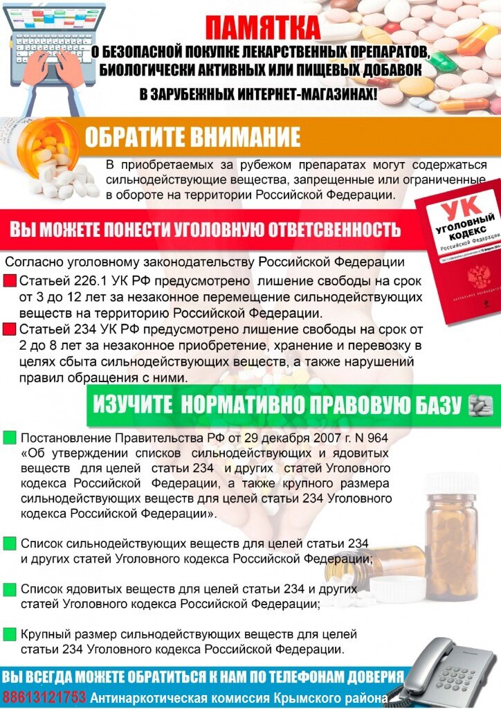 С целью информирования населения Министерство внутренних дел РФ разработало специальную памятку, где указана предусмотренная законом ответственность за приобретение препаратов с содержанием сильнодействующих веществ, опасных для здоровья человека, под видом биологически активных или пищевых добавок в иностранных интернет-магазинах.