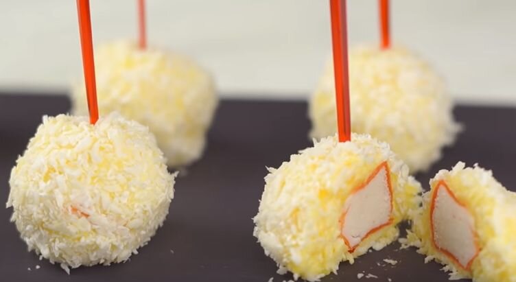Такую закуску можно приготовить и по-другому - слепить из яично-сырной массы шарики, вовнутрь положить маслину и обвалять в измельченных на мелкой терке крабовых палочках.