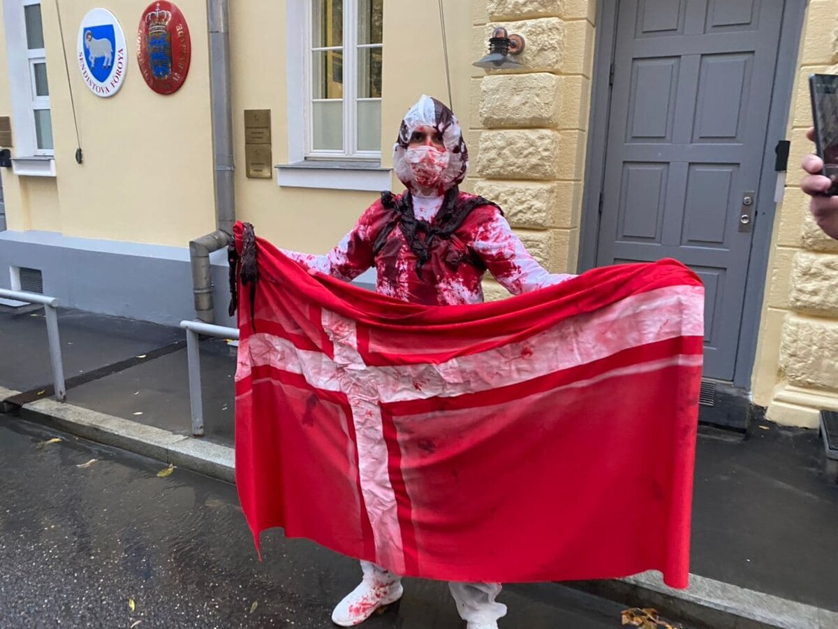 Сегодня «Зелёная Альтернатива» провела акцию у посольства Дании в защиту 12 млн норок, которых власти североевропейского государства приговорили к смерти из-за выявленного у зверей мутировавшего штамма коронавируса. Наш активист в белом одеянии с прикреплёнными к нему шкурами норок и государственным флагом североевропейского королевства символизировал правительство Дании, которое умоется