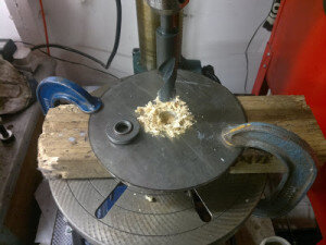 Вырезан круг диаметром 17.5 мм. Было просверлено отверстие посередине для возможности установки на «болгарку». Отверстие должно соответствовать размеру посадочного места “болгарки”. Важно, чтобы диск был сбалансирован, для этого нужно его сделать очень ровным. Края нужно затупить, для безопасности при работе.Чтобы сделать изгиб вокруг поверхности диска, был вставлен болт в центральное отверстие и зажат в тисках.