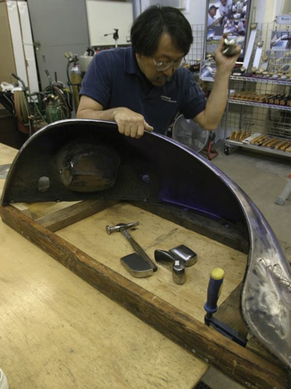 Кен Сакамото (Ken Sakamoto) мастер кузовного ремонта, рихтовщик высочайшего класса. Он занимается правкой металла более 40 лет. Он открыл свою собственную мастерскую ещё в далёком 1978 году. Несмотря на то, что он потерял интерес восстанавливать и изменять автомобили ещё лет 15 назад, Кен не растерял свои навыки владения инструментами и сейчас управляет своей компанией «Sunchaser Tools» в Пасадене (пригород Лос-Анджелеса в Калифорнии). Эта компания существует с 1989 года и занимается обеспечением качественным оборудованием мастерских кузовного ремонта. Кроме компании по изготовлению и поставке инструментов Кен Сакамото несколько лет назад открыл школу, чтобы передавать многолетний опыт рихтовки и формовки листового металла. В этой статье опубликованы фотографии с описанием мастер-класса Кена по ремонту деформированной панели кузова без применения шпаклёвки. Кен ручается, что этой технологии может научиться каждый. Самым популярным является его 3‑х дневный курс, где он подробно рассказывает о техниках рихтовки и доведения панели до оригинального состояния. Разработанный им набор «Metall-shrinking kit» поставляется с видео диском, на котором он также всё подробно объясняет. В мастер-классе, разобранном в этой статье Кен показывает действие метода фрикционной системы (использование усадочного диска shrinking disc). Подробнее об этом диске можете прочитать в статье “усадочный диск (shrinking disc)”. Сакамото возит с собой несколько крыльев от старых автомобилей, на которых демонстрирует действие его технологии.