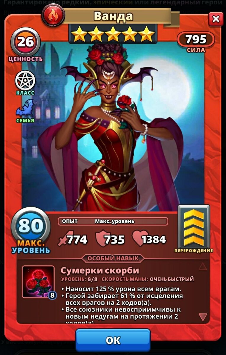 Начнём с того, что у Ванды нет в ульте никаких интересных особенностей. Её ульта — это всего лишь небольшой урон по всем в размере 125 % (для сравнения — у 🔴 Могильщика — 135 % по трём целям, но есть 298 единицы тикающего урона и дополнительный урон Природе). Также она забирает 61 % от исцеления у всех врагов на 2 хода. Ну и иммунитет к недугам на 2 хода для всех союзников. Было бы интересно, если она одаривала бы всех союзников сворованным из-за своего вампиризма здоровьем, но нет :(