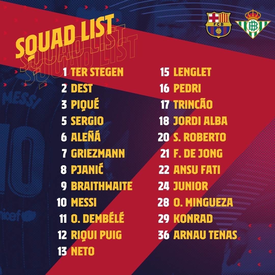 👥 тер Штеген, Дест, Пике, Бускетс, Аленья, Гризманн, Пьянич, Брейтуэйт, Месси, Дембеле, Пуч, Нето, Лангле, Педри, Тринкау, Альба, Роберто, де Йонг, Фати, Фирпо, Мингеса, Конрад, Тенас