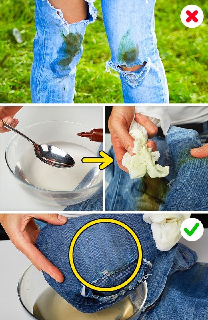 Каждому родителю знакомы детские джинсы, колени которых постоянно в грязи и траве. Чтобы в момент убрать зелень с одежды, можно сделать так: