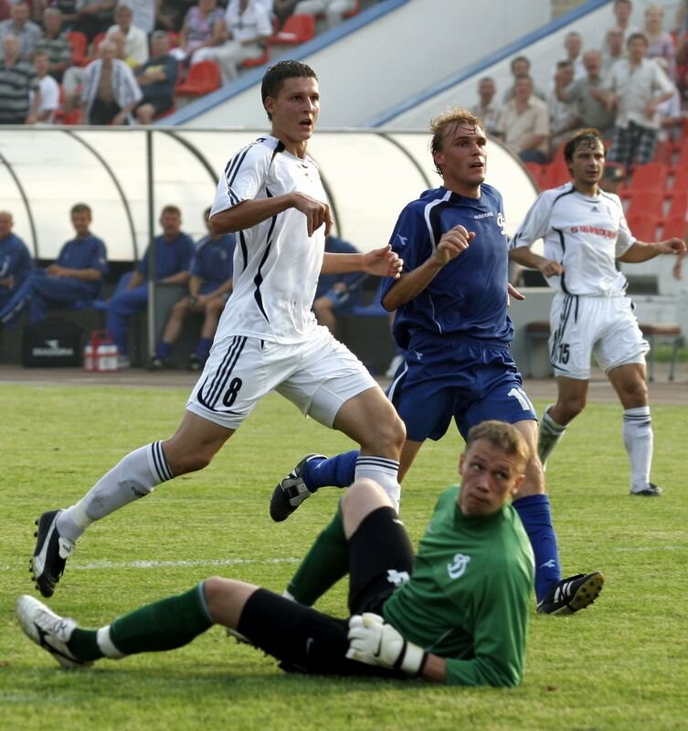 А до этого, в поединке первого круга в Хабаровске соперники расписали «ничейку»- 0:0. Уже с первых минут игры футболистам обеих команд пришлось бороться не только с соперником, но и с сильнейшими порывами ветра, которые затрудняли борьбу на втором этаже и делали непредсказуемыми длинные верховые передачи. Первыми приспособились к сложным погодным условиям хозяева, они повели массированное наступление на ворота «Динамо». Первый по-настоящему опасный момент возник в штрафной гостей на 18-й минуте. Лев Корнилов слева низом прострелил вдоль ворот, но Максим Живновицкий не успел замкнуть передачу. Спустя две минуты хабаровчане получили право на штрафной. Андрей Мурнин наносил сильнейший удар метров с 35-ти (причем против ветра), однако мяч отразила левая стойка ворот. Последовал второй удар, который блестяще парировал Георгий Шелия, а под третий бросился кто-то из брянских защитников. Лишь ценой самоотверженных усилий динамовцам все же удалось сдержать атакующий порыв армейцев. Во втором тайме подопечные Сергея Горлуковича окончательно и бесповоротно обосновались на половине поля соперника. «Динамо» не помышляло даже о контратаках, но оборонялось цепко и умело. Отчаявшись добиться успеха в ближнем бою, хабаровчане сместили акцент на дальние удары. На 70-й минуте лишь отчаянный бросок Шелия, непостижимо как отбившего «выстрел» Мурнина из-за пределов штрафной, спас бело-голубых от неминуемого гола. А спустя семь минут вратарь «Динамо» вновь в прямом и в переносном смысле этого слова оказался на высоте, отразив штрафной в исполнении все того же Мурнина. В концовке встречи гости уже откровенно играли на удержание ничейного счета, падая на газон при каждом столкновении или, не мудрствуя лукаво, отбивая мяч подальше от своих ворот. Такая бесхитростная, но эффективная тактика помогла им добиться нужного результата. Дальневосточное турне динамовцам удалось: далеко не каждая команда может похвастаться тем, что привезла из Владивостока и Хабаровска четыре полновесных очка.