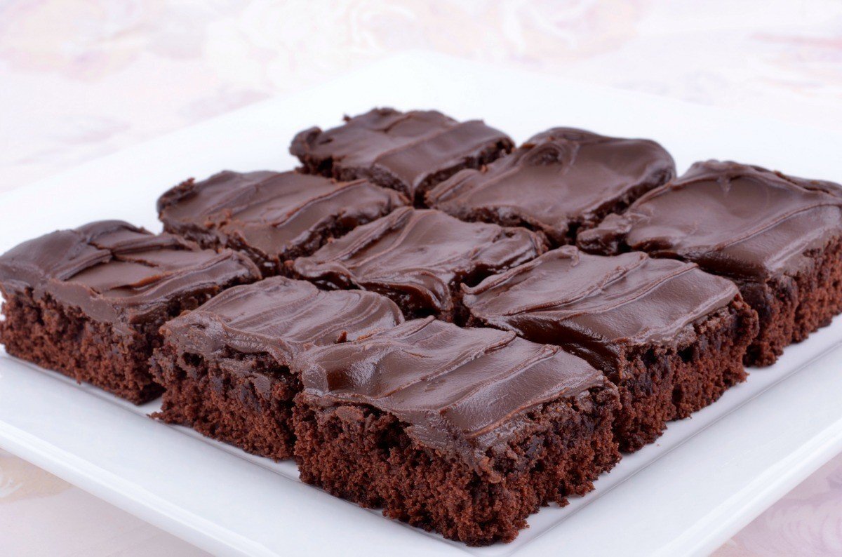 Когда бисквит готов, ему нужно дать пару минут отдохнуть, залить глазурью. Так как я готовлю в большой квадратной форме, то ингредиенты для бисквита также беру на 2 порции, затем готовый торт разрезаю на квадратные кусочки.