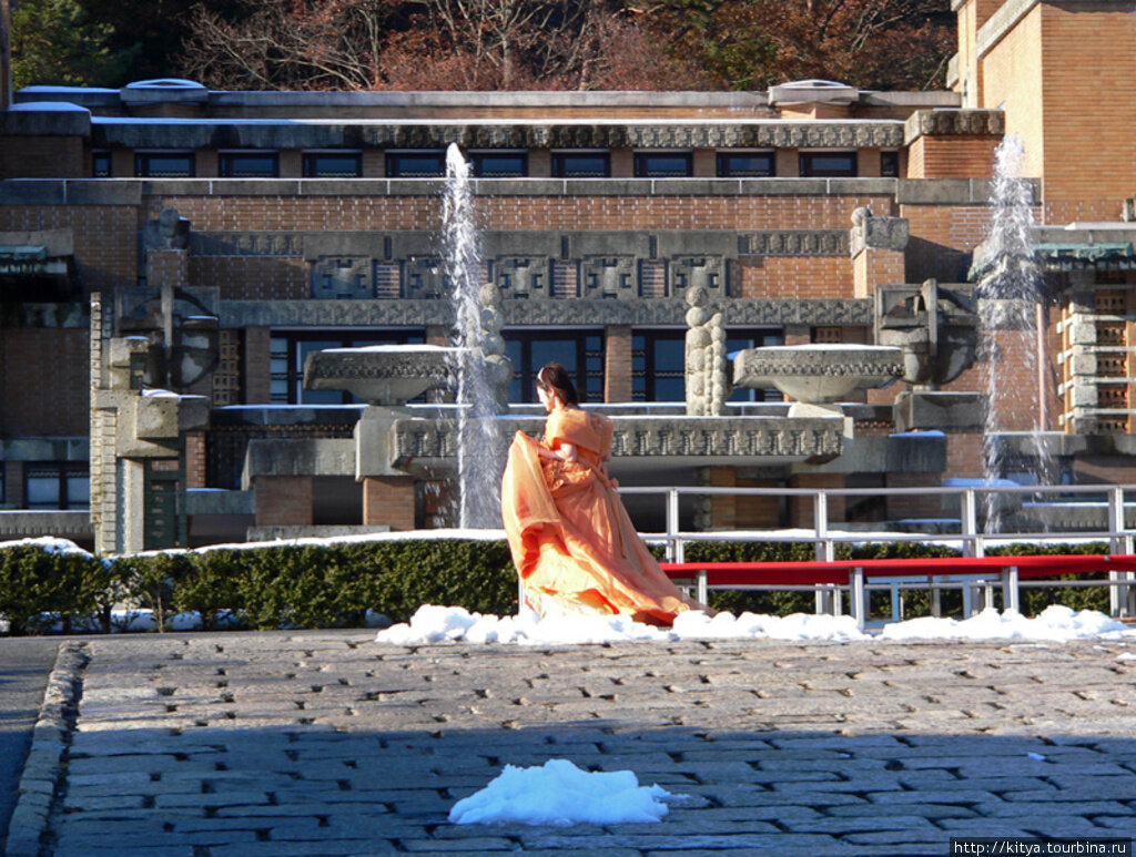 Вот это здание - знаменитый имперский отель, который построил в Токио в 1922 году американец Франк Ллойд Райт. Удивительное здание, построенное из пористого камня города каменщиков Оя. Когда американский архитектор выбрал этот камень для строительства - японцы протестовали. Камень Оя - самый дешевый камень, из которого здесь строят заборы. Японцы просили построить из мрамора, чтобы все было как в лучших домах Европы, по-настоящему. Но Райт настоял на пористом, малосимпатичном, камне Оя. А ровно через год после окончания строительства, в 1923-ом году произошло Великое Землетрясение Канто. Погибли тысячи, весь Токио был разрушен. И только единственное каменное здание устояло. Имперский отель Франка Ллойда Райта, из пористого камня Оя.