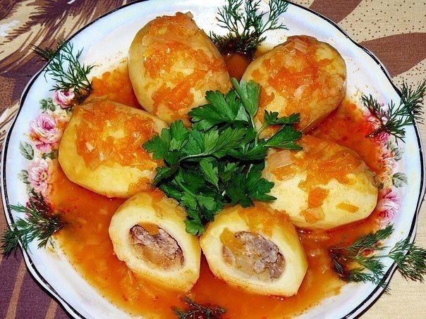 На раст.масле обжариваем мелко нарезанный лук, затем натёртый на крупной тёрке морковь, хорошо обжариваем, добавляем томатный сок и перемешиваем. Выкладываем фаршированный картофель, добавляем воду, по вкусу добавим соль, чёрный перец и сушенный базилик . Доводим до кипения , накрываем крышку и ждём до готовности примерно 20-25 минут. Готовое блюдо посыпаем зеленью и подаём к столу.