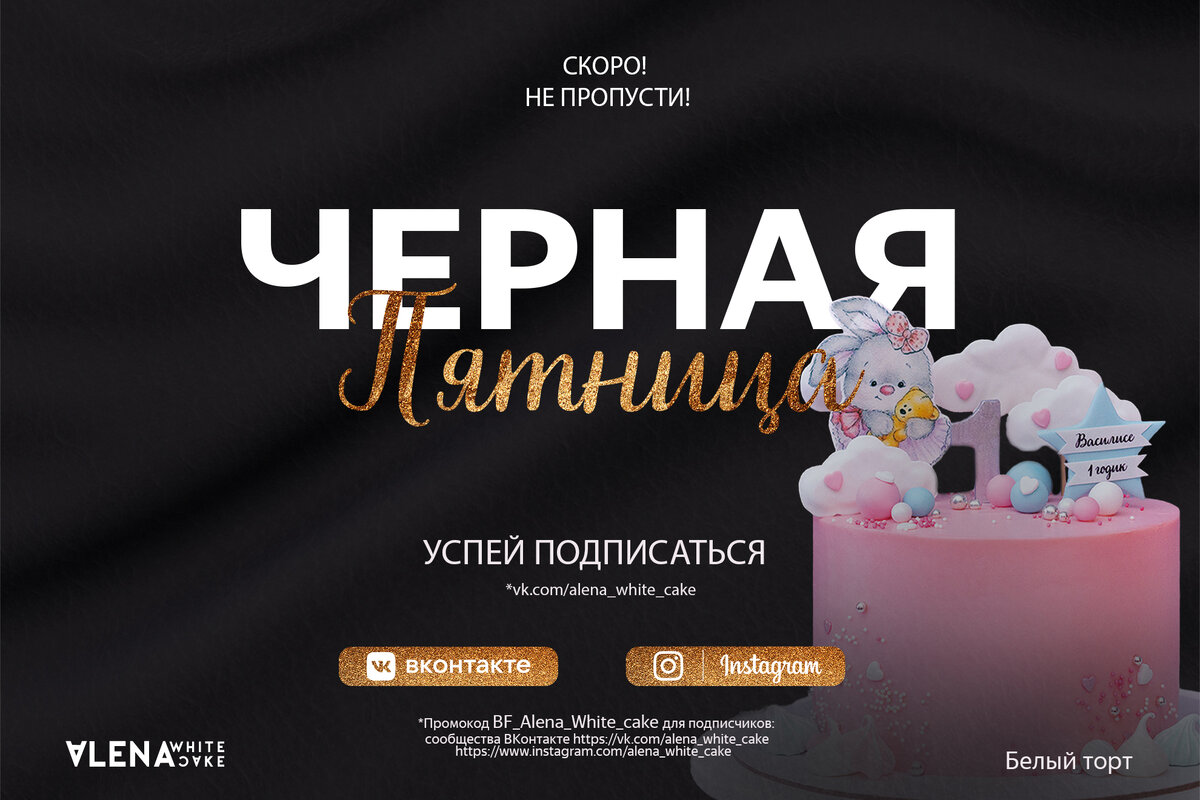 Для подписчиков сообщества Белый торт https://vk.com/alena_white_cake и Инстаграм https://www.instagram.com/alena_white_cake в «Черную пятницу» ждут уникальные предложения. Кто случайно не подписался , подписываемся!
