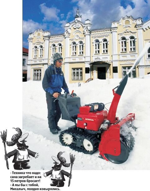 Дальность выброса зависит от плотности снега. Свежий и пушистый летит далеко, слежавшийся же после бурана - на расстояние в 2-3 раза меньше, чем указано в паспорте, поэтому и проходы «туда-сюда» придется делать чаще. Словом, как бы аппарат ни облегчал уборку территории от снега, потрудиться все-равно придется.