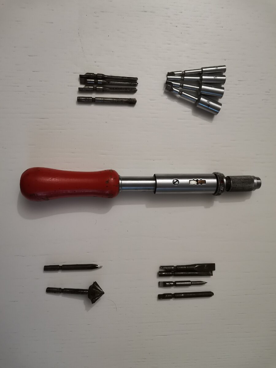 Несколько лет назад в сети увидел обзор на реверсивную отвёртку из далёких времён, когда колбаса была вкуснее, а трава зеленее. Для себя отметил, что неплохая штуковина. И вот не так давно, на одной из интернет барахолок выскочила она, искал совершенно другую отвёртку, и эта появилась, да и по бросовой цене- поехал и взял. С ней в комплекте шли различные насадки или как сейчас говорят- биты, но, к сожалению, не все. В те далёкие времена, когда о электрических шуруповёртах только мечтали или представляли в мечтах, была такая вот отвёртка. В действие приводится мышечной массой и если вдруг сядет аккумулятор в шуруповёрте, то можно воспользоваться этой отвёрткой)