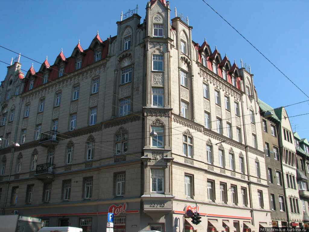 Третий день нашего путешествия мы решили начать с прогулки по звездным местам Югендстиля. Маршрут был собран из многих источников интернета и сложен воедино. Вот что из этого получилось. В начале карта маршрута maps.google.ru/maps/ms?msid=2… Начало было, как обычно, от нашей гостиницы на Гертрудес. План был намечен очень большой , но аппетит на просмотр красоты утолить трудно, особенно, когда это делаешь дома за компьютером. Хочется посетить все и сразу. На местности начинаешь понимать, как нереальны твои планы, но лучше выбрать из большого количества информации, чем долго думать, куда еще сходить. Ну ладно хватит отступлений, вперед на покорение неизведанных вершин. Первый объект, захвативший наше внимание находился на улице Terbatas — дом 33/35. Здание построено в стиле Романтизированный Югендстиль. Он воспроизводит формы исторических стилей. В основном, это щипцы крыш и зубцы на карнизах. Орел на карнизе башни завершает композицию. Tērbatas iela, 33/35