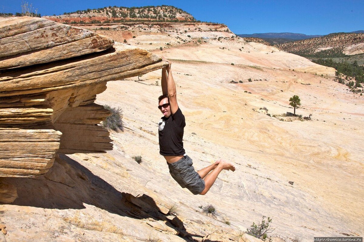 Маленький городок Boulder в штате Юта, находится на 12 шоссе немного к северу от Escalante (Лестница - чудесница: Попробуй заберись). Прямо перед городом заканчивается широкое и разноцветное плато Экскаланте, а за городом к северу начинаются уже совсем другие горы, ведущие в сторону Национального Парка Кэпитол Риф. Мы продолжали нашу поездку на трех фэт боях и одном софт тейле.Именно здесь мне довелось испытать весьма необычное состояние. Возможность предоставилась, когда мы тормознули на обочине, открывшей перед нами практически бесконечное плоское поле бежевого и розоватого оттенков, наполненное плавными геометрическими формами гор и редкими растениями. Вдали виднелось какое-то подобие стены, к которому мы в небольшом составе и отправились. Большая часть группы осталась сидеть на обочине дороги и смотреть на то, как наши фигуры превращаются в миниатюрные точки, чуть ли сливаясь с розово-желтым пейзажем. Я держался чуть дольше других, так как был в черной майке, но и я как мне потом сказали "растворился" в этой небесно-пространственной пустоте. Поэтому показываю только фотографии с человеком в лиловой майке )Но это не мои воспоминания, а тех кто видел меня... Для меня же это была еще одна игровая площадка как и в Слот-каньоны: Сорвать аплодисменты, но не застрять..., но только другая. Здесь можно было босиком бегать по засушенным руслам рекИграть в разноцветные камушкиИли висеть на скалеНо это все лирика, подобная музыке Кантри. Музыке Кантри в стране Кантри.Главным было, что нельзя никак рационально подойти к этому опыту а также понять что он оставил во мне. Этот опыт находится вне всех вопросов Что? Зачем? и даже Как? Это место мне показалось пустотой, пробелом между звуками слов или сливающимися промежутками дорожных столбов, если проноситься на мотоцикле со скоростью 100 миль в час либо материализацией того места, где стыкуются правое и левое полушарие головного мозга. В нем замедлялось время и было непонятно сколько мы там времени провели. Хотя когда мы вернулись ребята нам сказали, что не очень долго, хотя не исключено, что они там просидели сутки, и какое сегодня число...Про этот опыт я вспомнил потом, когда спустя некоторое время вернувшись в Москву, монтировал про нашу поездку фильм. Я тогда взял какое-то количество песен разных авторов, которые у меня ассоциировались с нашей поездкой, и произвольно интуитивно распределил их по фильму. Песней, которая пришлась на это место, стала песня кантри Вейлона Дженнингса (Waylon Jennings) под названием "I’ve always been crazy but it’s kept me from going insane"...