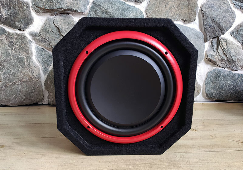 Корпус изготовлен из 16 мм МДФ, панели которой склеены между собой. Внешняя сторона корпуса проклеена черным карпетом с красными декоративными ставками. В контрастном цвете сделано прижимное кольцо вуфера, порты фазоинвертора и, конечно же, усилитель – размещены на красном алюминиевом профиле.