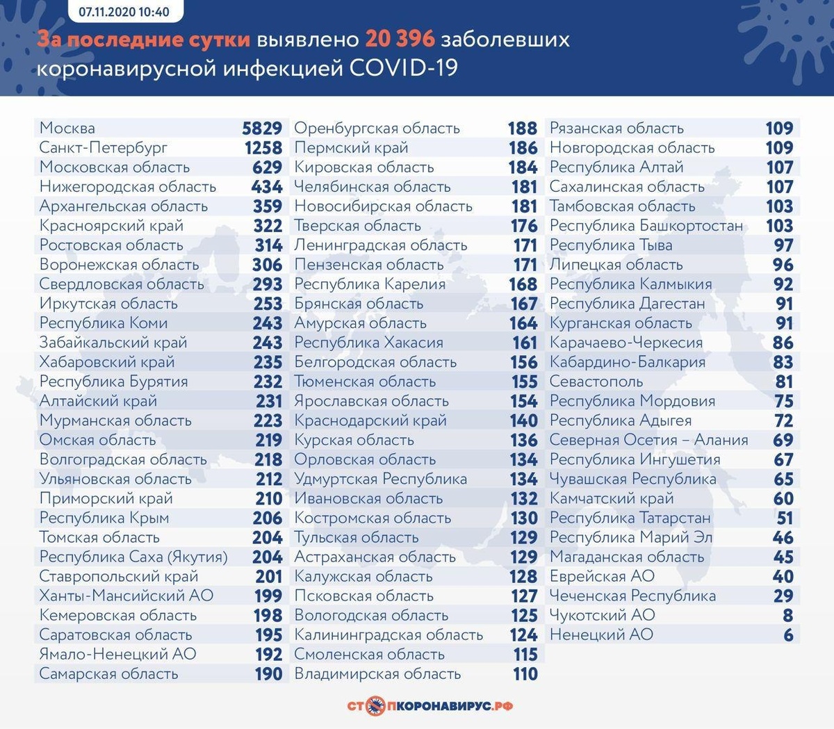 В России выявлено 20 396 заболевших коронавирусом за последние сутки!