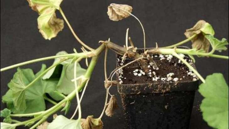 Если у пеларгонии: чернеют и сохнут листья;оно покрывается бурыми пятнами;ствол возле почвы чернеет и ослабевает,растение поражено черной ножкой.Развитию заболевания способствует переувлажнение,переохлаждение,уплотнение почвы.Не допускайте переливов,следите за температурным режимом,рыхлите почву,чтобы был доступ влаги к дренажу.