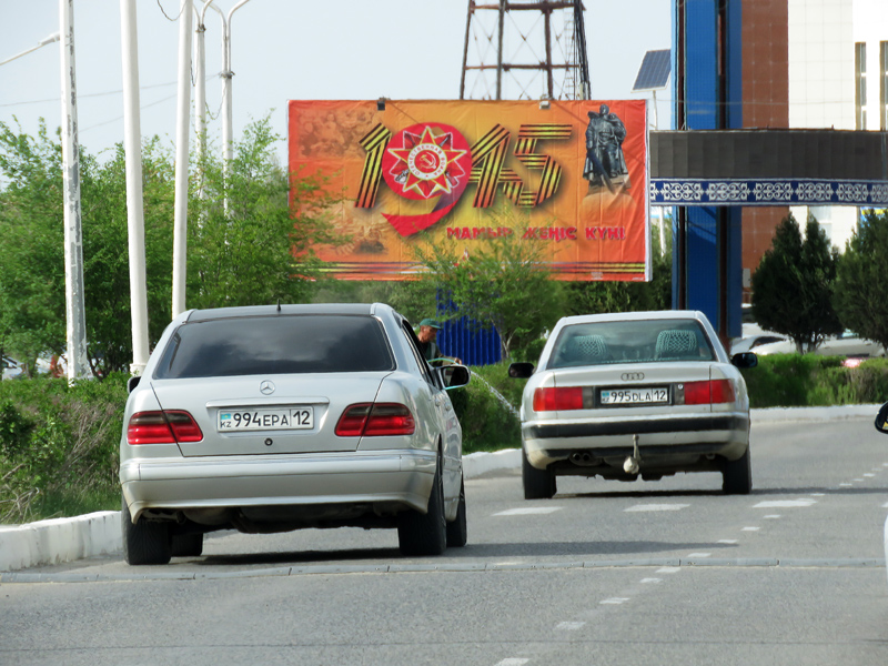 В Казахстане я второй раз оказываюсь в День Победы. И как видите, сообщения о запрете в Казахстане георгиевских лент - враньё. Вроде бы, какую-то свою национальную ленту как альтернативу тут правда пытались ввести, и где-то в порядке "перегибов на местах" ей действительно пытаются заменить георгиевскую, но в этих краях она, судя по всему, пока что не прижилась: Главные празднования с парадом военной техники проходят, конечно же, в Астане, в других местах - лишь праздничные концерты и митинги. День Победы-2015 в Алма-Ате и Капчагае запомнился мне натуральным культом красноармейской военной формы, в которую рядили что детей для выступления на торжетсвах, что охранников в городских магазинах. А вот День Победы-2017 мы наблюдали из окна машины, поэтому и запомнился он мне в основном автомобильным креативом на тему: Но общее ощущение осталось тем же - День Победы в Казахстане праздник такой же народный, как и у нас, но только празднуют его здесь как-то более прямолинейно и бесхит