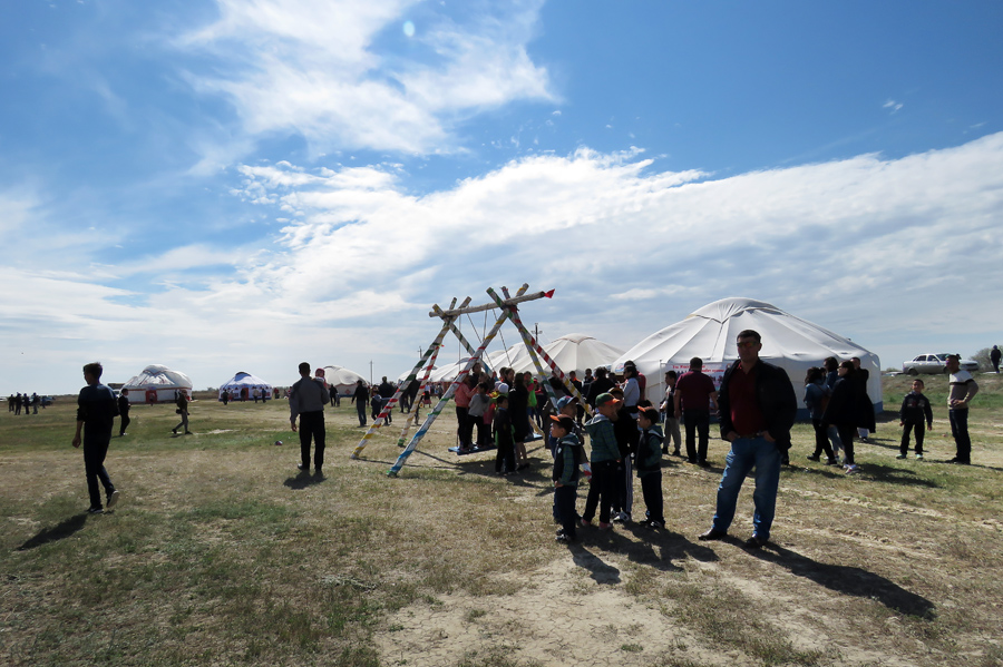Рно утром покинув Атырау, начавший праздновать День Победы ещё с вечера 8 мая, на 77-м километре в степи у дороги мы вдруг увидели толпы людей у лагеря белых юрт, и я предложил заглянуть туда на полчасика.