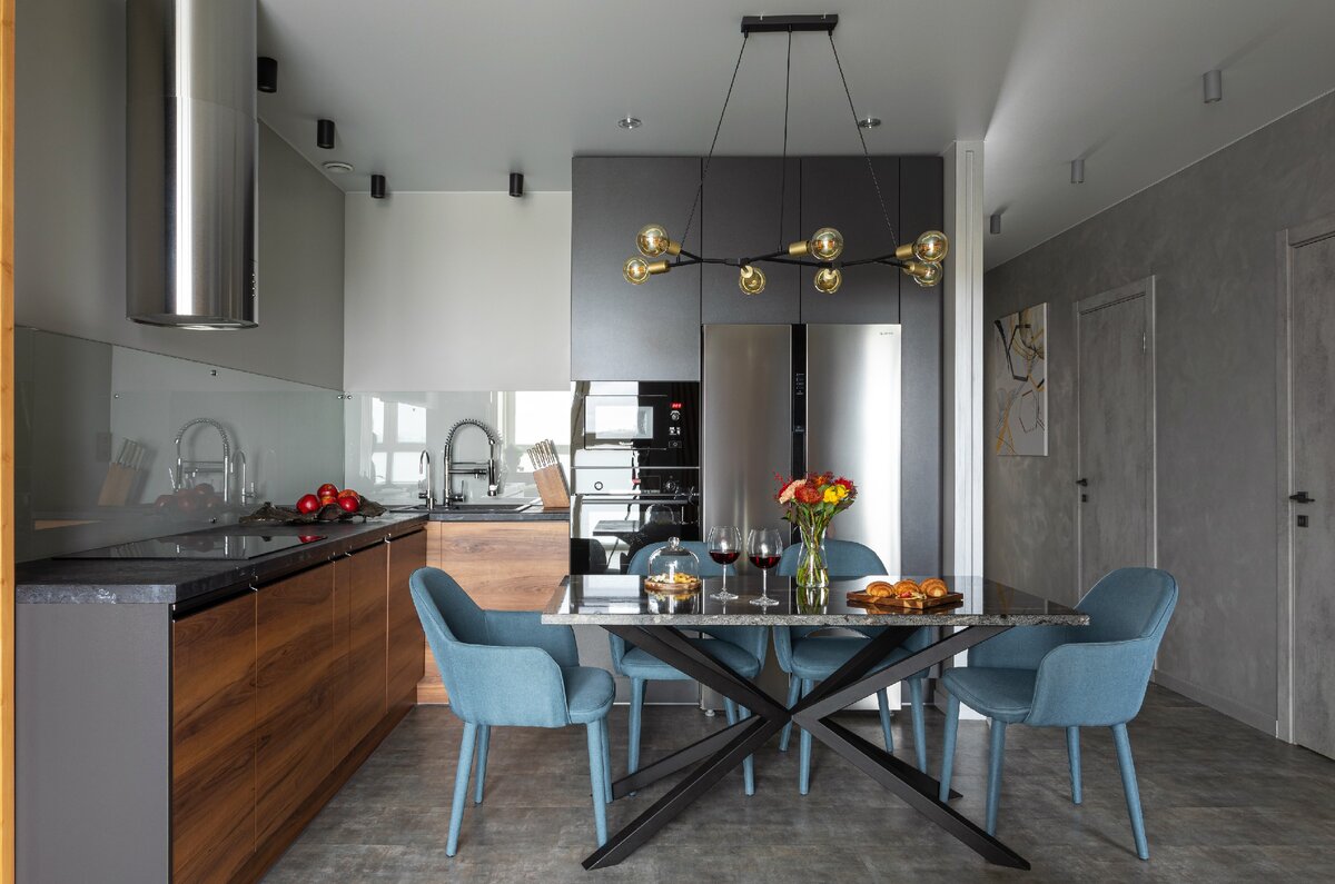Владельцы квартиры — молодая семья с детьми — готовят не так уж часто, любят завтракать в кафе. Поэтому при обустройстве кухни ориентировались на ее «гостевые» качества: она должна быть удобной для встреч с друзьями и семейных посиделок за настольными играми. От верхних шкафов кухонного гарнитура изначально решили отказаться, чтобы оставить больше воздуха, к тому же у хозяев просто нет необходимости в большом количестве мест хранения.