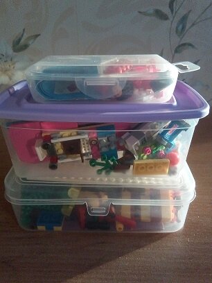 1. Первое над чем мы все ломаем голову, куда убрать лего? Его обычно так много. Ребенку дарят много наборов. Они смешиваются и когда он обычно садится играть, нескольких деталей не хватает и начинается поиск. Игра превращается в уборку. В раскладывание все по местам и по коробочкам, а со временем детали опять смешиваются. Потому что ребенку не интересно все это убирать в неудобную коробку. Коробка такая огромная, а лего в ней занимает всего 1/3 места. Нет столько места чтобы хранить все эти большие коробки. И я придумала выход.