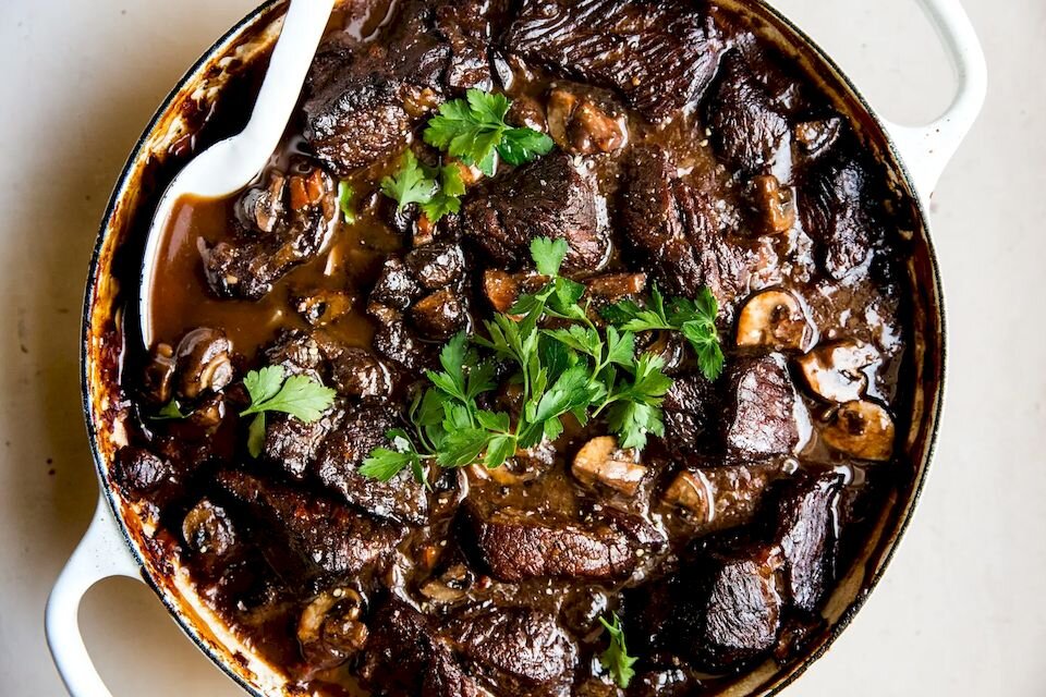 Никто не сможет устоять перед богатым и пикантным удовольствием тушенной во рту говядины, тушенной в вине.