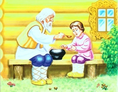 Мальчик заблудился в лесу и несколько суток не ел. Наконец он вышел к избушке. В ней жил старец-отшельник.