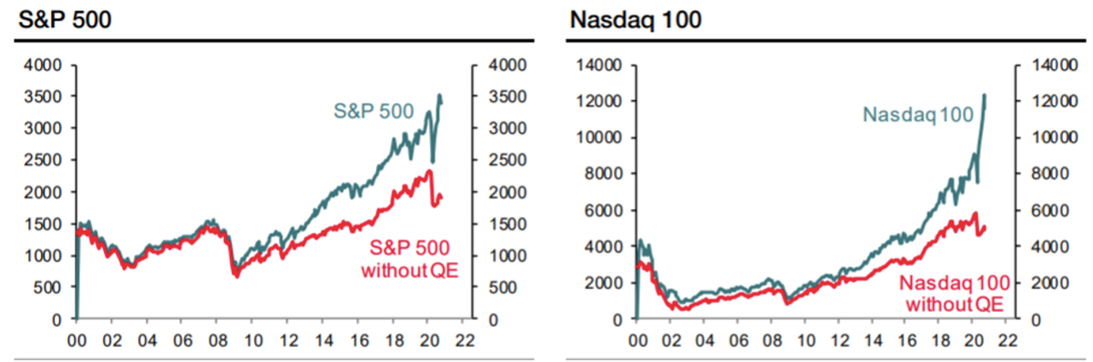 Стратеги Societe Generale заявляют, что S&P 500 торговался бы ближе к 1800 без покупки облигаций Федеральной резервной системой США. (на 7 ноября 2020 года индекс находится на отметке 3509 пунктов).