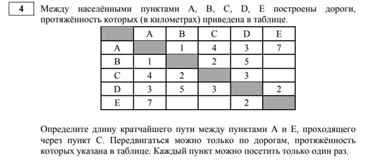 ОТВЕТ: Кратчайший путь из А в E через город C равен 8.