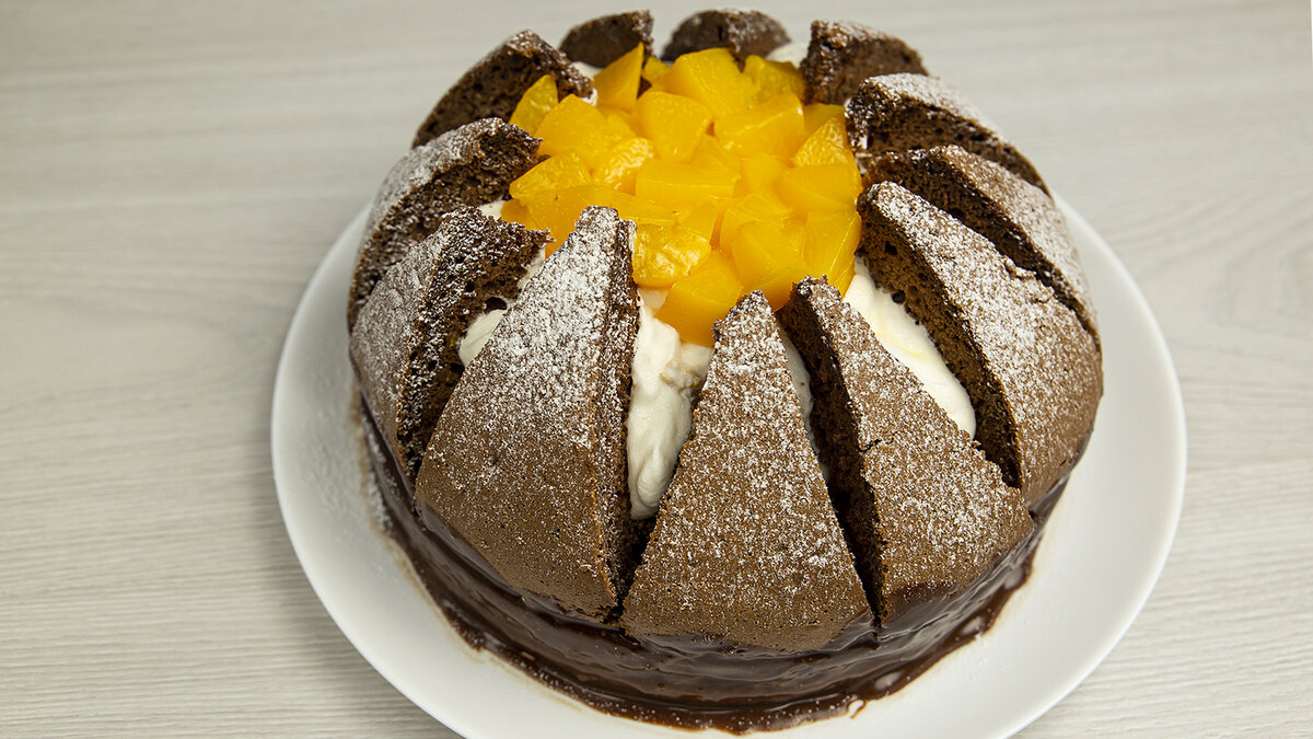 Торт «Килиманджаро» привлекает своим необычным и оригинальным внешним видом. Получается тортик очень вкусным и нежным, за счёт йогуртового крема. А готовится торт совершенно несложно, как это может показаться на первый взгляд. Форма диаметром - 24-25 см. Нам понадобится: Бисквит: Яйца - 4 шт. Сахар - 150 гр Мука - 170 гр Какао - 2 ст.л. Разрыхлитель - 1 ч.л. Крем: Сливки (жирность от 33%) - 400 гр Йогурт - 400 гр Сахарная пудра - 80 гр Желатин - 10 гр Персики (консервированные) - 850 гр Шоколад - 40 гр Способ приготовления: 1. Сначала приготовим бисквит для торта. Взбиваем яйца с сахаром примерно 3-4 минуты, пока масса не побелеет и не увеличится в объеме 2. Смешиваем муку, какао и разрыхлитель. Просеиваем сухие ингредиенты во взбитые яйца, перемешиваем до однородного состояния 3. Перекладываем тесто в форму для выпечки. Выпекаем бисквит в заранее разогретой духовке 20-25 минут при 180°. Готовность проверяем зубочисткой, если палочка сухая, значит бисквит готов 4. Персики нарезаем не