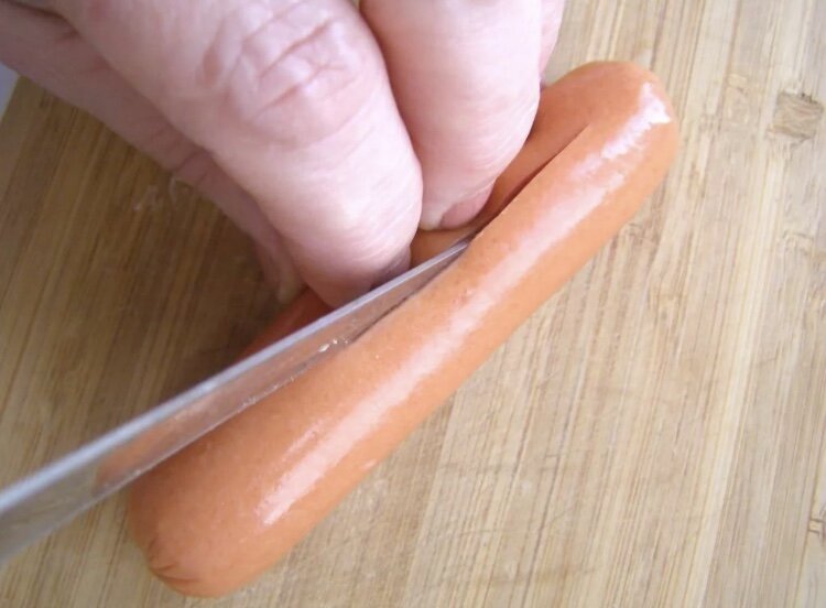 - Далее разворачиваем сосиски и режим их на две половинки вдоль и кладём туда сыр 🧀