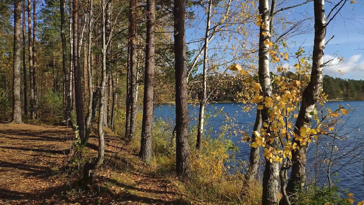 Осенний лес. Прогулка у красивого лесного озера в теплый октябрьский день.