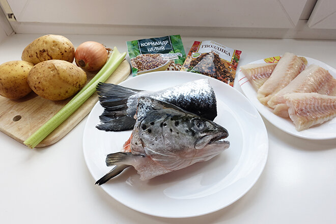 1. Начинаем с бульона. К суповому набору из семги добавляем сельдерей, кориандр, гвоздику, небольшую луковицу и соль по вкусу.