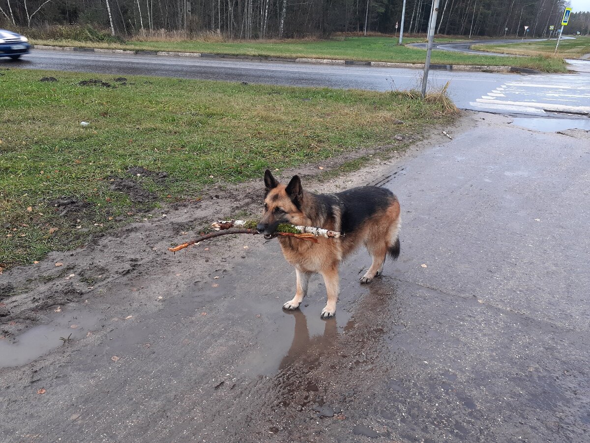 Возвращались с собакой Кирой с прогулки. Еще с нами были Луша, такс Макс и их хозяйка. Кира, как обычно, дрова заготавливает на зиму :)