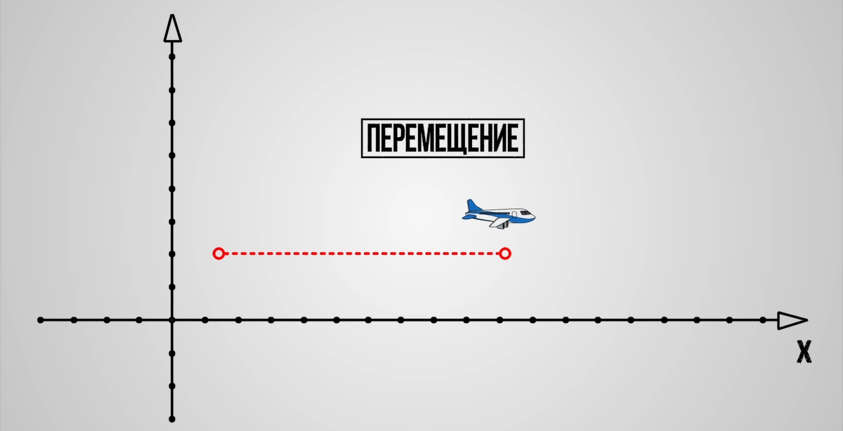 Первая величина это “Перемещение”. Под перемещением будем понимать направленный прямой отрезок, начало которого совпадает с начальным положением физического тела, а конец совпадает с точкой, где