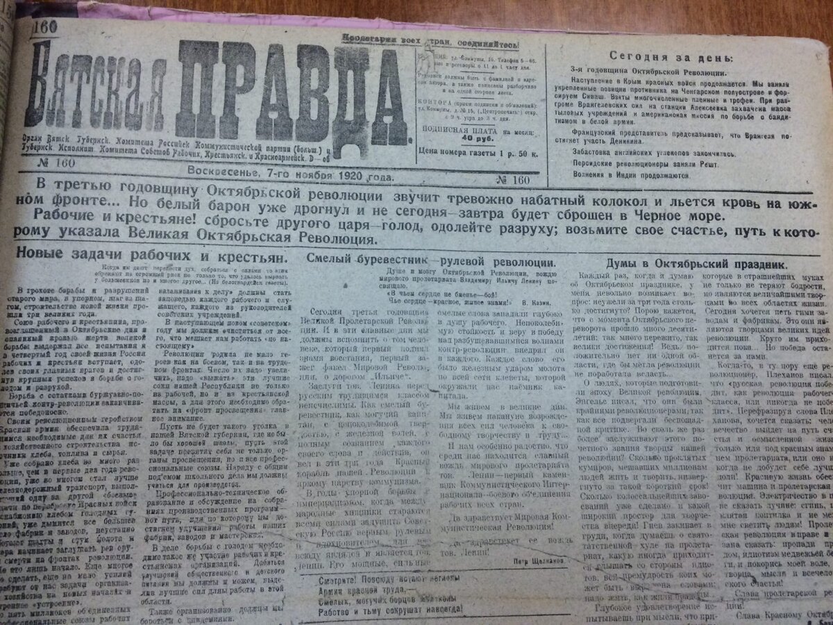 "Вятская правда" № 160, 7 ноября 1920 годаС революции минуло лишь три года, и вся Россия находилась в процессе гражданской войны. Газета "Вятская правда" вела постоянную работу по пропаганде среди гражданского населения идеи социалистического строя, очернения его противников и героизации революционеров. Может эти слова звучат громко, но в те времена в СМИ весьма легко прибегали к громким заявлениям.
