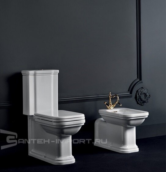 Для интерьеров, стилизованных под старинные дворцовые помещения, подойдут напольные массивные изделия с обилием лепнины и роскошного золотого или бронзового декора. Вместо уже привычных кнопок смыва на бачках могут быть установлены ретро-рукоятки. Некоторые модели оснащают высокими бачками с керамическими ручками на цепочках. Для оформленных в роскошном дворцовом стиле санузлов подойдут модели из коллекций итальянского бренда Migliore: Gianeta, Impero, Milady.