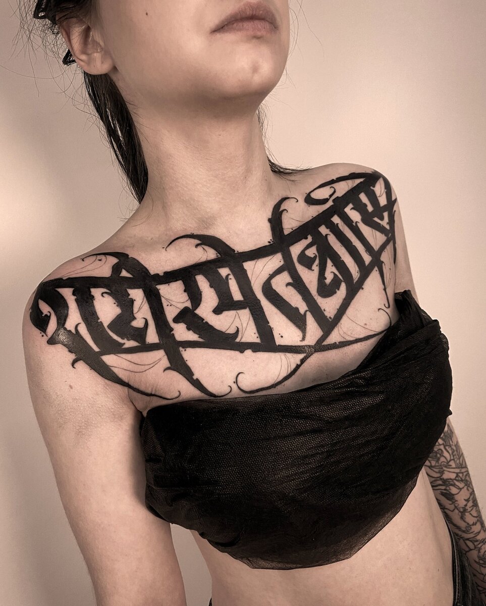 Татуировка с символами на женском теле выше груди говорит о смелости и неукротимом