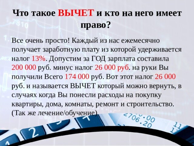 Налоговым вычетом является возврат ранее уплаченного гражданином налога. Получить его можно, если деньги потрачены на: