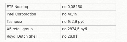 ETF Nasdaq по 0,0825$ Intel Corporation по 46,1$ Газпром по 162,9 руб Х5 retail group по 2874,5 руб Royal Dutch Shell по 26,9$